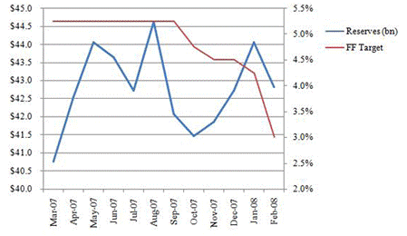 Figure 2 is very surprising. (It was to me, at least, when I first saw the numbers behind it.) It's true, the conventional relationship held up from October 2007 to January 2008, when total reserves increased as the Fed lowered its target. But this was only after total reserves had fallen sharply from August through October.