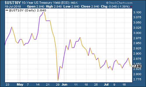 However, markets aren't entirely convinced by the bullish argument. There are definite concerns growing over the health of the global economy. This is partly due to fears over a slowdown in China, concerns about trade wars, and just a general sense that the US is perhaps "overdue" a downturn. The yield on the ten-year US Treasury bond was again, virtually unchanged this week. I'll be taking a long look at the yield curve, and why people worry about its potential inversion, in the email on Monday.