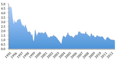 As you can see, in 1995, more than five years after the Japanese stock market peaked and the economy started to cool, Japanese government bonds (JGBs) were still yielding 4.5%. Seventeen years later, yields on JGBs are now sitting at 0.77% as repeated attempts to stimulate the economy and increase inflation have failed.