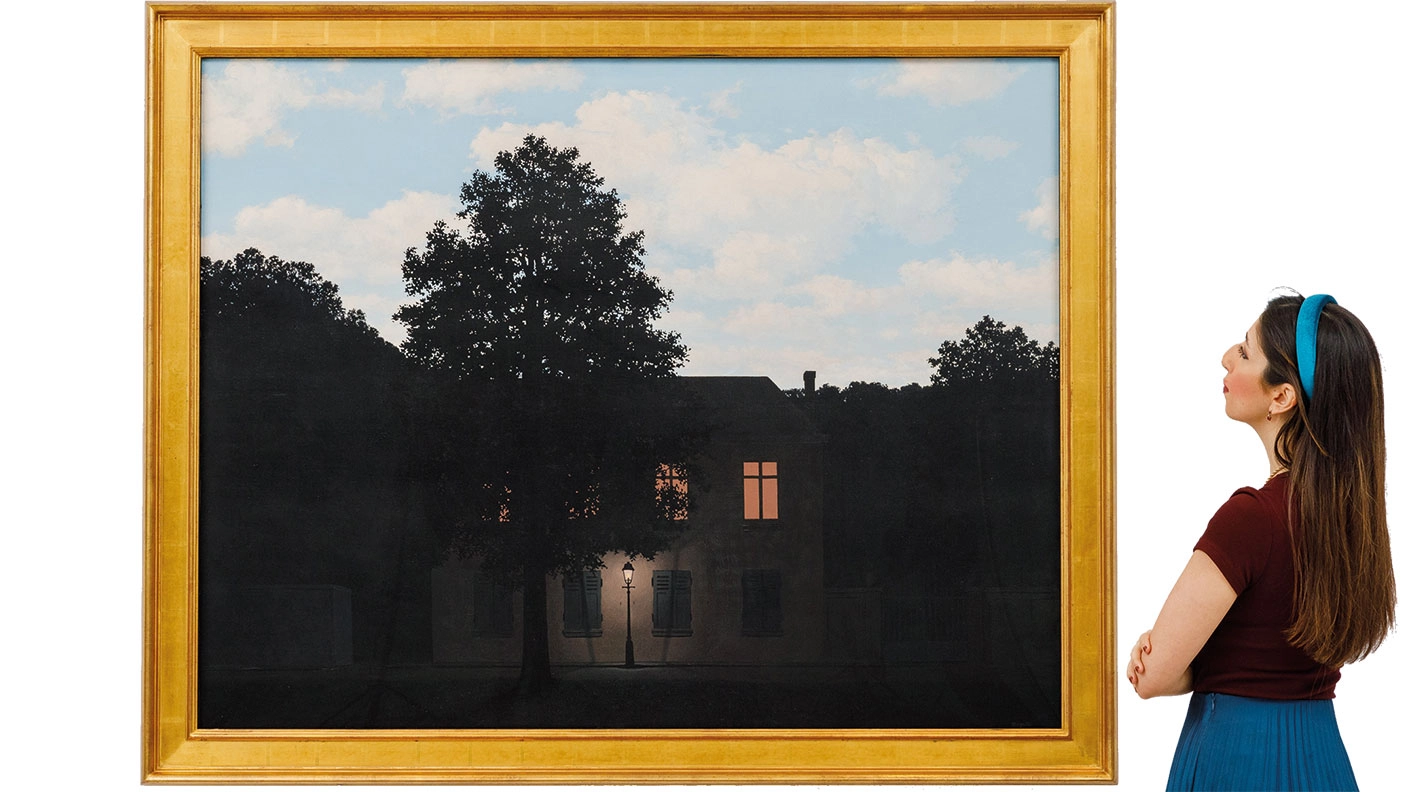 The stand-out sale of last week, however, went to yet another auction debutante: L’empire des lumières (1961), by Belgian surrealist René Magritte. The iconic work (pictured), one of 17 that form a series, contrasts day and night over a typical suburban house on a quiet street in Brussels. One possible inspiration for the piece is André Breton’s poem L’Aigrette, which opens: “If only the sun were to come out tonight”. It certainly came out for Sotheby’s in London that evening – the painting sold for £59.4m.