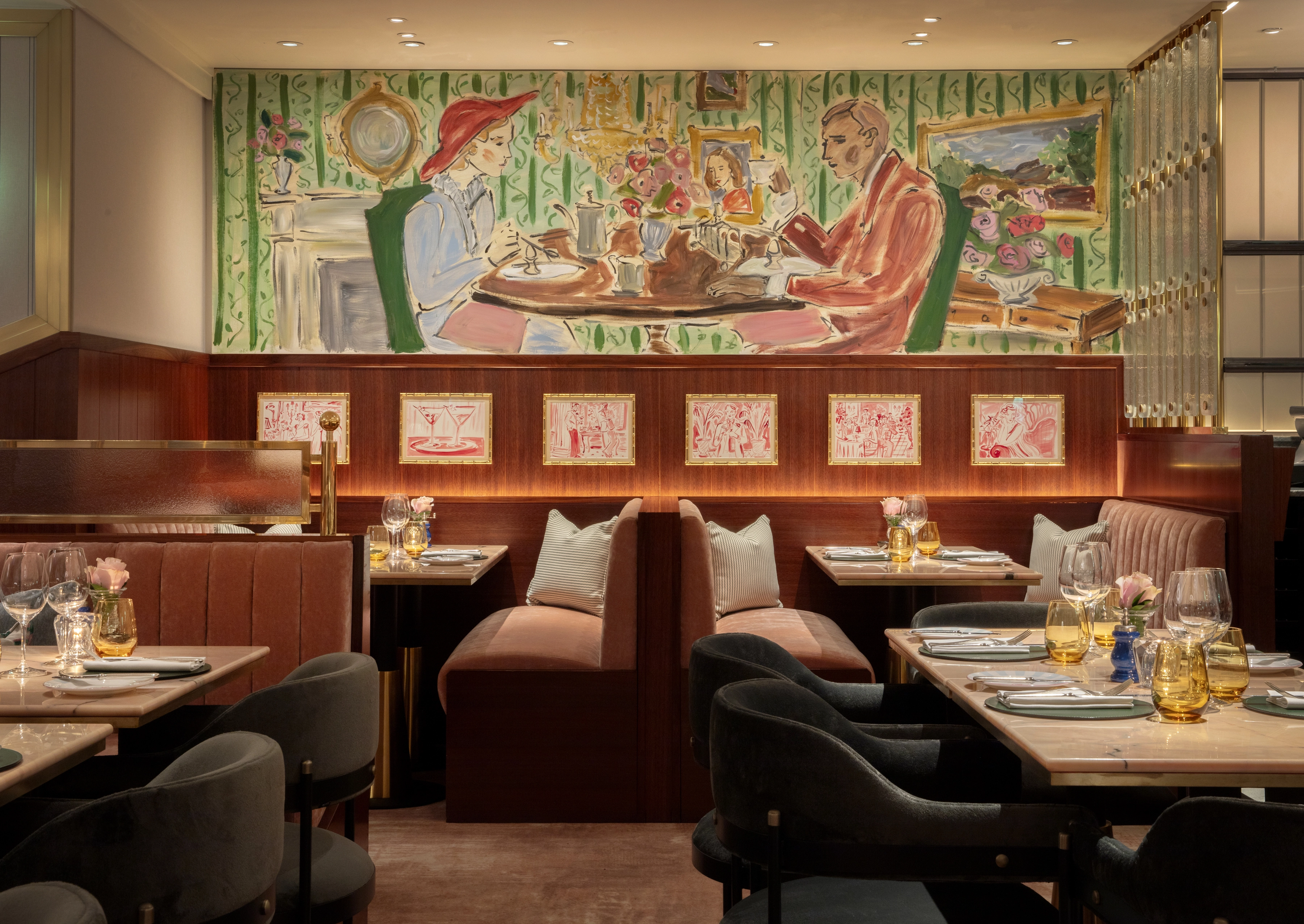 Rosi is a cosy space, and the redesign sets the stage for this welcoming, nostalgic venue. The walls are panelled with Luke Edward Hall paintings that evoke New York in the 1930s; pastel pinks and sage greens are all around, creating a space that is elegant and inviting, with the two-tier space lined with plush banquette seating.
