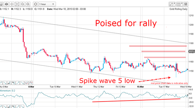 I shall cover gold today because that market shows a wonderful Elliott wave pattern, which I have been following (see Monday's Trader post). In addition, the market had become extremely bearish going into Wednesday; it seemed unlikely it would go further down.