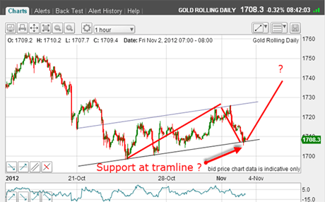 I have an excellent tramline pair, complete with aprior pivot point(PPP) on the upper line.The market is currently testing support at the lower tramline at the $1,709 level.