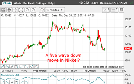 The quiz therefore consists in finding five-wave declines off this week's highs in various markets (you can add your own if you wish). And note that this analysis is a fiscal cliff-free zone.