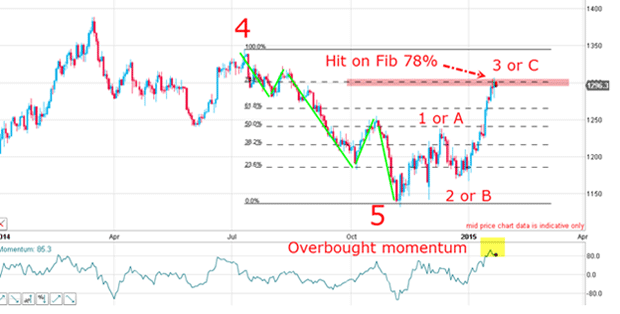 The second thing the chart reveals is that the current gold price is right at the 78% level. And according to Fibonacci theory, it looks likely that the rally should run out of steam around now.