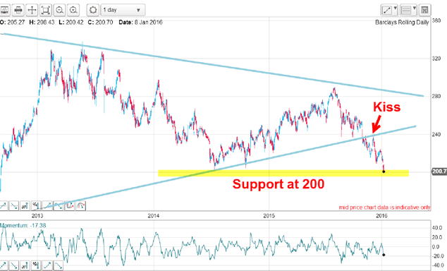 But I just couldn't resist tracking Barclays which is one of the largest global banks. It sported a compelling chart pattern and it was the multi-year wedge that caught my eye. This is the chart I showed in December: